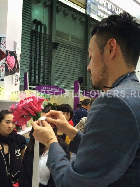 Mr. Sato, японский дизайнер-флорист, работающий в бюро Николая Бергманна, проводит мастер-класс на выставочном стенде Florever.